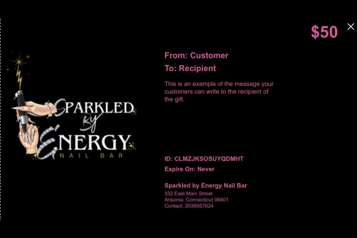 Choose a gift card from Sparkled by Energy Nail Bar and give the gift of a perfect nail experience. Our gift cards are available in various amounts and can be used for any of our services.